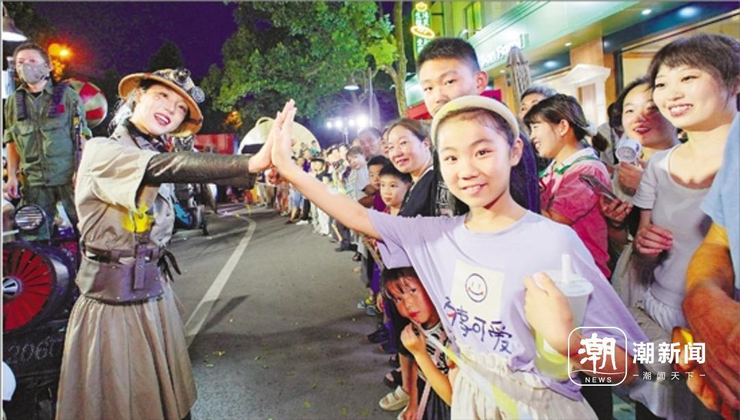 8月1日晚,金华双龙风景区“开罗吉市”开街。图为巡游队伍与游客互动。 记者 陆欣 叶振宇 摄