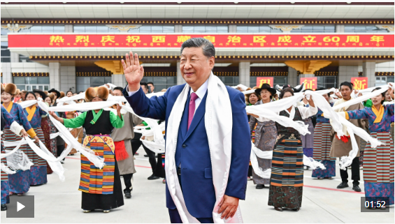 央视新闻讯 中共中央总书记、国家主席、中央军委主席习近平率中央代表团20日中午乘专机抵达拉萨,出席西藏自治区成立60周年庆祝活动。习近平等在机场和拉萨市区受到西藏各族群众的热烈欢迎。中共中央政治局常委、全国政协主席、中央代表团团长王沪宁,中共中央政治局常委、中央办公厅主任蔡奇等同机抵达。