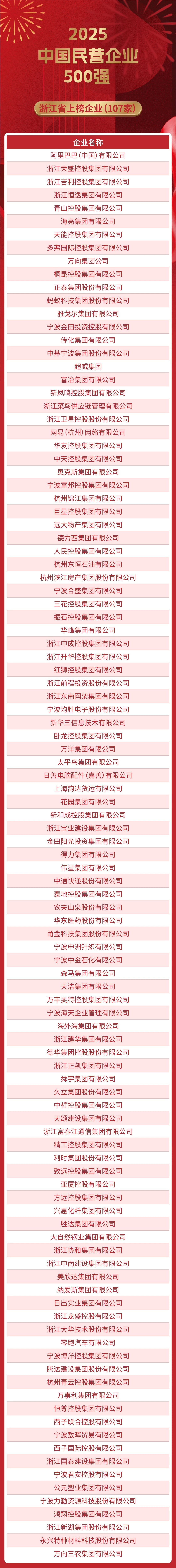 浙江107家企业上榜“中国民营企业500强”,较去年净增1家,上榜企业数量连续27年位居全国首位;109家企业上榜“中国制造业民营企业500强”,与去年持平;20家企业上榜“中国服务业民营企业100强”,较去年净增1家。