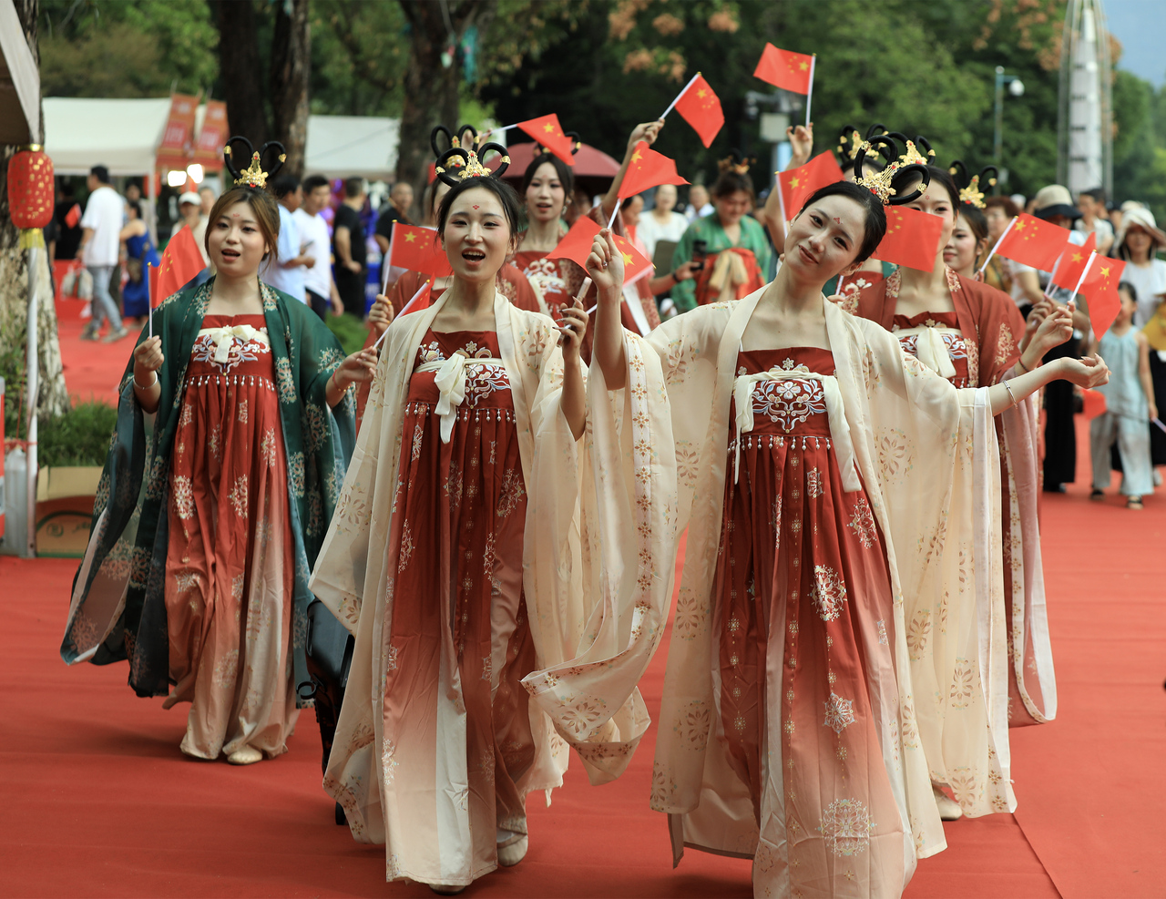 10月1日,温岭市锦屏公园,市民们身着盛装,手拿小红旗,庆祝祖国华诞。拍友 周学军 摄