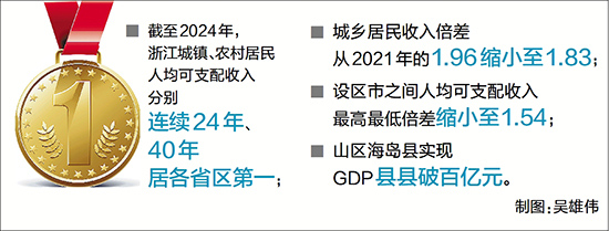 截至2024年,浙江城镇、农村居民人均可支配收入分别连续24年、40年居全国各省区第一,城乡居民收入倍差从2021年的1.96缩小至1.83,设区市之间人均可支配收入最高最低倍差缩小至1.54,山区海岛县实现GDP县县破百亿元……