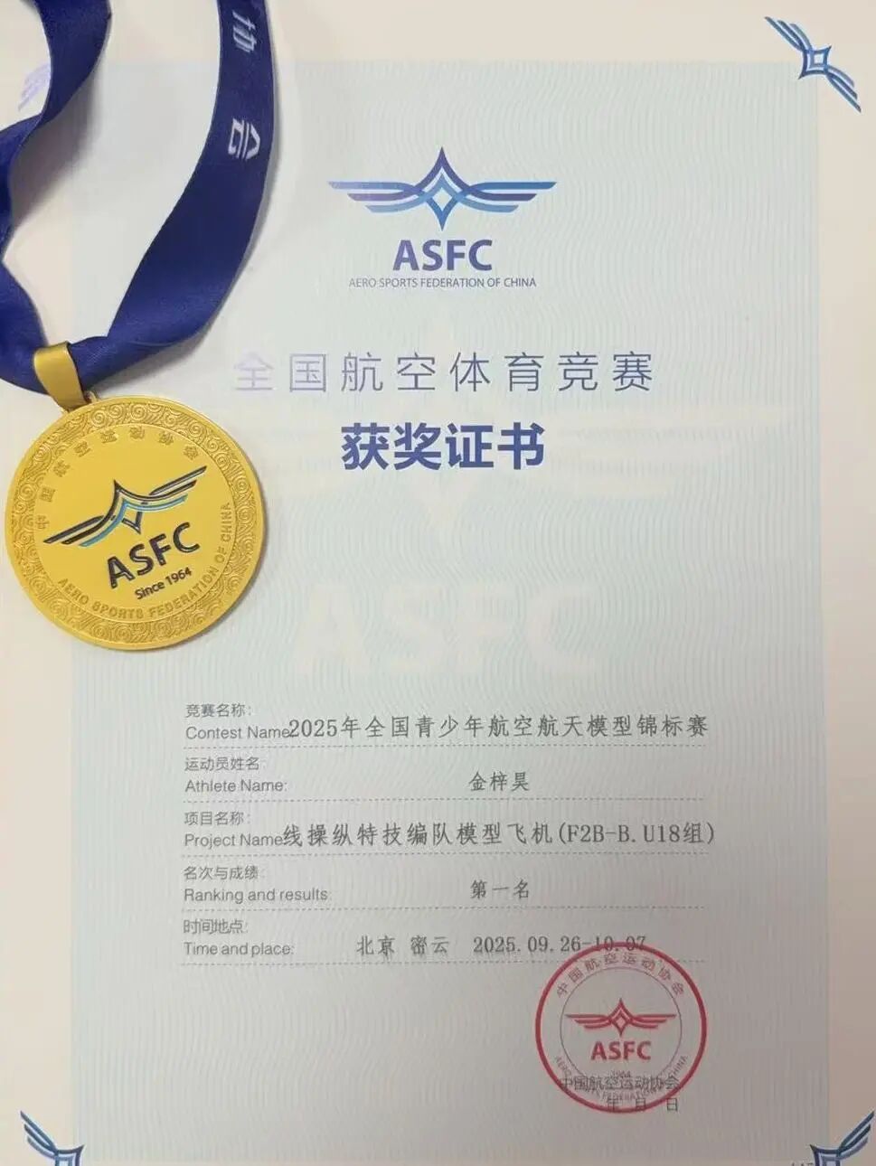 在众多项目中,杭州育才中学初二学生金梓昊表现尤为亮眼。他与杭州第十四中学朱睿同学合作,在线操纵特技编队模型飞机(F2B-B.U18组)项目上配合默契,凭借稳定发挥和出色技术夺得全国冠军。同时,金梓昊还在三级线操纵特技模型飞机(F2B-3.U14组)项目中再获一金,成为本次赛事“双冠王”。