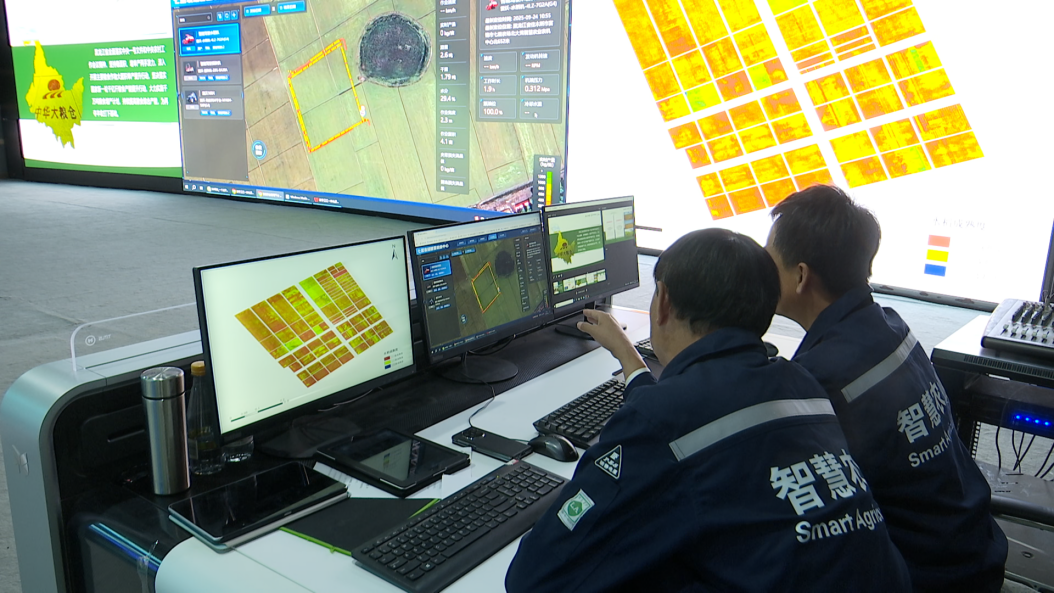 工作人员通过智慧农业数字指挥平台研判水稻成熟度(央广网发 李延生 摄)