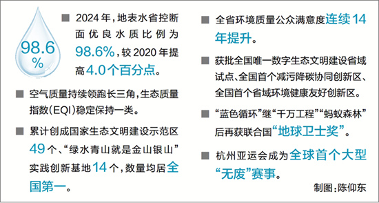五年间,浙江建成全国首个生态省,“蓝色循环”继“千万工程”“蚂蚁森林”后再次荣膺联合国地球卫士奖;到2025年,浙江生态环境公众满意度连续14年提升。今年9月,省委、省政府作出加快建设高水平生态省战略部署,提出“三优化一提升”,美丽浙江建设再上新台阶。