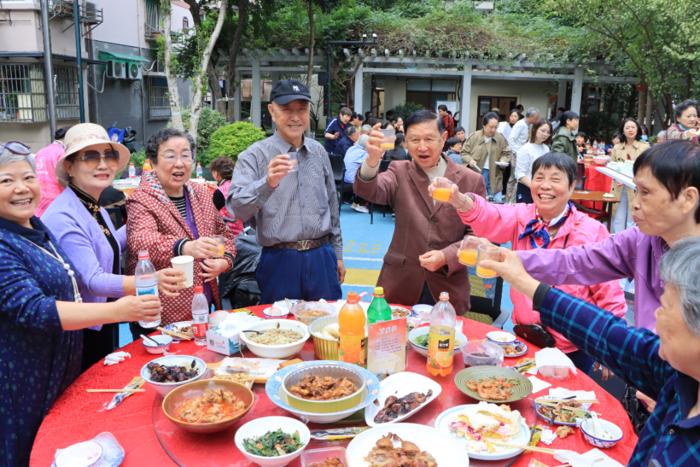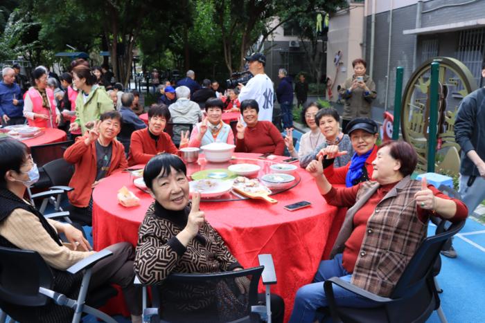 随后,众人期待的百家宴在温馨的祝福声中热闹开席。社区特邀辖区内东华、桐山村、新月新、邀月楼、流芳面馆、巧媳妇、好乐益等多家知名餐馆联袂献艺,打造出一场丰盛的味蕾盛宴。十余桌居民欢聚一堂,品美食、话家常,分享生活点滴,敬老的温情与邻里的欢笑在此刻完美交融。