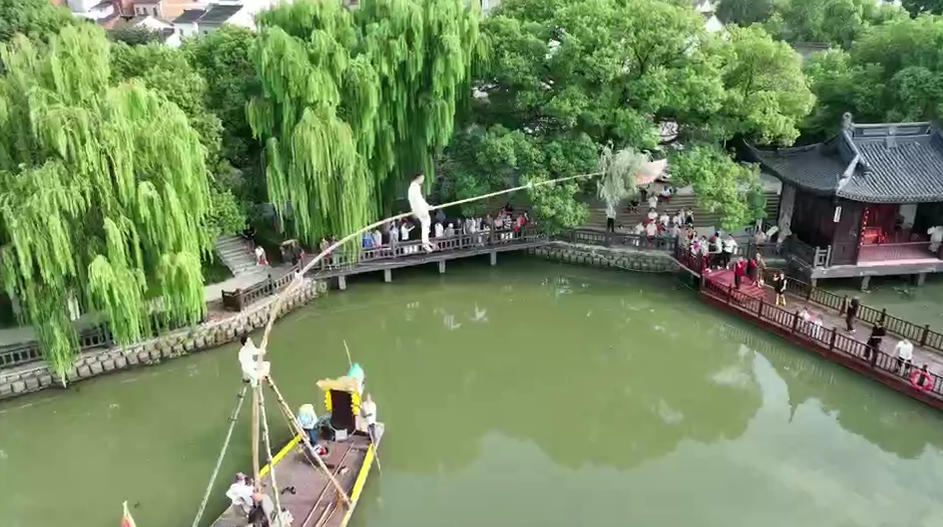 近日,桐乡洲泉镇马鸣村的将军湖畔人头攒动,所有人的目光都锁定在湖面中央的竹竿上——国家级非遗高杆船技的表演者,正在10多米高的竹竿上完成“神仙操作”:睡竹时身躯与竹身贴合成一体,坐竹时稳如磐石,顺橇、反橇间尽显灵动,“猴子拜佛”“超人”等高难度动作引得观众惊呼连连。“从海宁特意赶过来,这表演太震撼了!”游客朱国楚说,这场“空中芭蕾”让他直观感受到了非遗的魅力。