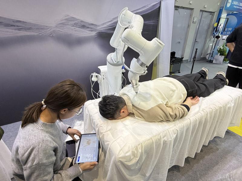 参观者正在体验智能理疗机器人 记者 孙婧宜 摄