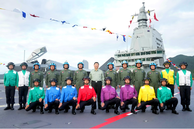 11月5日,我国第一艘电磁弹射型航空母舰福建舰入列授旗仪式在海南三亚某军港举行。中共中央总书记、国家主席、中央军委主席习近平出席入列授旗仪式并登舰视察。这是习近平同舰载机飞行员、航空保障人员合影留念。
