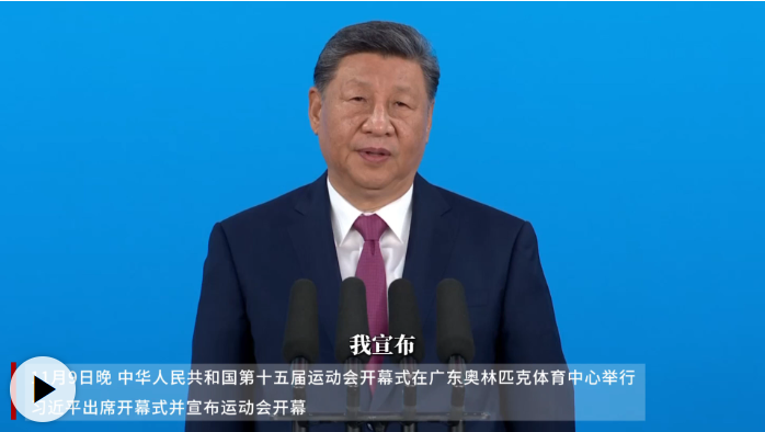 11月9日晚,中华人民共和国第十五届运动会在广东省广州市隆重开幕。中共中央总书记、国家主席、中央军委主席习近平出席开幕式并宣布运动会开幕。
