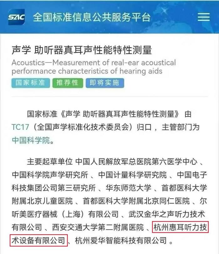 值得一提的是,惠耳听力作为主要起草单位之一,成功参与了国家标准《声学助听器真耳声性能特性测量》(GB/T 20242-2025)的制定,凭借其在声学技术领域的专业积累,为行业规范化发展做出了重要贡献。该标准由全国声学标准化技术委员会归口管理,中国科学院主管,已于2025年8月1日发布,将于2026年2月1日正式实施。