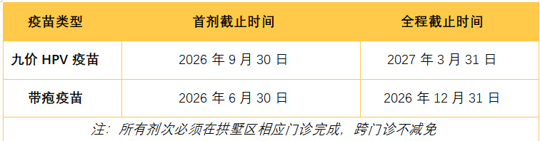 2025年12月1日至2026年9月30日期间,在拱墅区参与惠民活动的接种门诊完成首剂接种,并于2027年3月31日前在同一门诊完成全程接种。