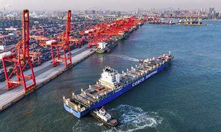 2025年12月5日,在山东港口日照港集装箱码头,满载集装箱的船舶驶离港口(无人机照片)。新华社发(李大伟摄)