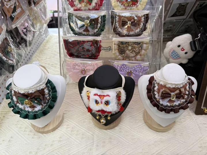 除了给孩子们添些“新期待”,不少养宠人也选择给自家“毛孩子”准备过年仪式感。几步之外,“Cookie饼干人”展架上挂满各种款式的宠物围兜,“这些是我们自主设计生产的,有些融入了传统吉祥元素。”负责人陈穆告诉记者,新年临近,“万事大吉”红色围兜等带年味的宠物服饰近期较受养宠人青睐,“大家都把宠物当家人,过年也想给毛孩子打扮一下,图个喜庆。”