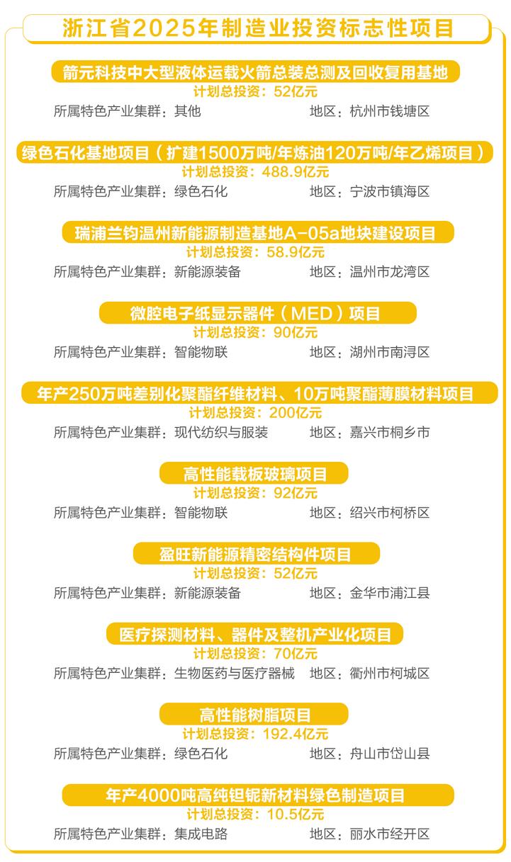 制造业投资是实体经济供给能力形成的基础和先行指标,重大项目更是重中之重。日前,2025年浙江制造业重大项目标志性项目名单出炉,全省共有十个项目入围。