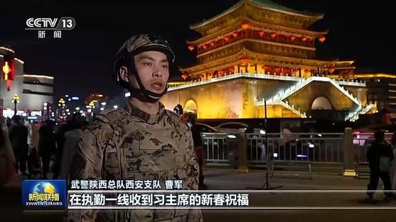 武警陕西总队西安支队 曹军:在执勤一线收到习主席的新春祝福,深切感受统帅的关怀牵挂。看到国家繁荣昌盛、人民幸福生活的热闹场景,倍感在战位上为祖国和人民守岁很有意义。春节期间,部队还注重科学统筹战备和生活,安排了形式多样的文体娱乐活动,让大家过节过得暖心安心;各类执勤值班保持规定状态,守护驻地平安。