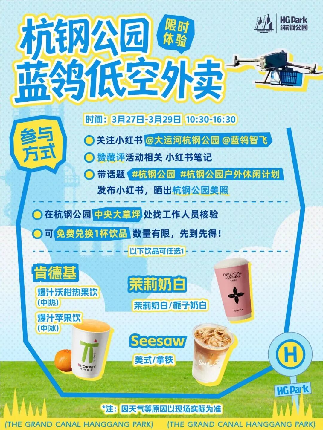 3月27日至29日,“杭钢公园&蓝鸰低空外卖限时体验”活动即将启幕。活动期间,大城北三个重要点位串起“空投航线”,肯德基、Seesaw Coffee、茉莉奶白、有的时烘焙餐厅、星巴克、101camp等多个商家加入“空投餐厅”阵营。现全城招募“飞享”搭子,让市民游客零距离感受科技赋能下的公园新生态。